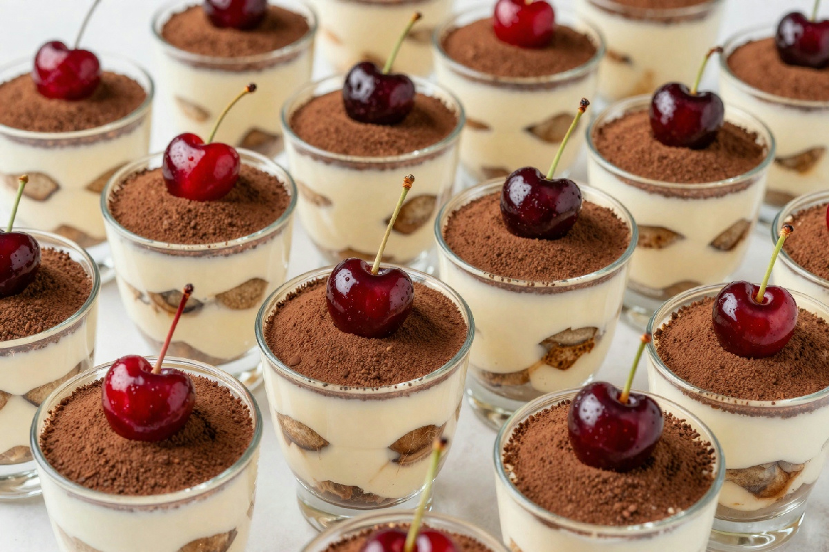 Prendi le ciliegie, lavale e snocciolale. Se vuoi, puoi anche tagliarle a metà o in quarti, a seconda della tua preferenza. Alcuni scelgono di frullarle leggermente per ottenere una sorta di salsa, ma io consiglio di lasciarle in pezzi per una consistenza più interessante. Ora, è il momento di assemblare il tiramisù. Immergi i savoiardi nel caffè, uno alla volta, e disponili sul fondo dei bicchierini. Alterna uno strato di crema al mascarpone e uno di ciliegie. Ripeti l’operazione fino a esaurire gli ingredienti, terminando con la crema. Infine, spolverizza con cacao amaro e decora con qualche ciliegia fresca sopra.